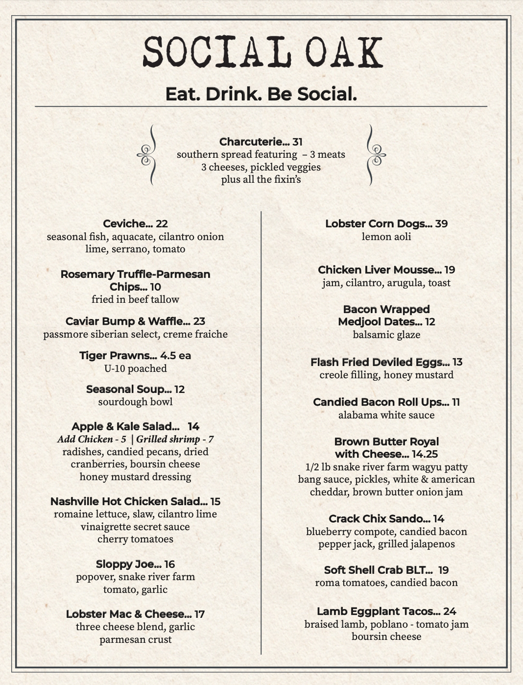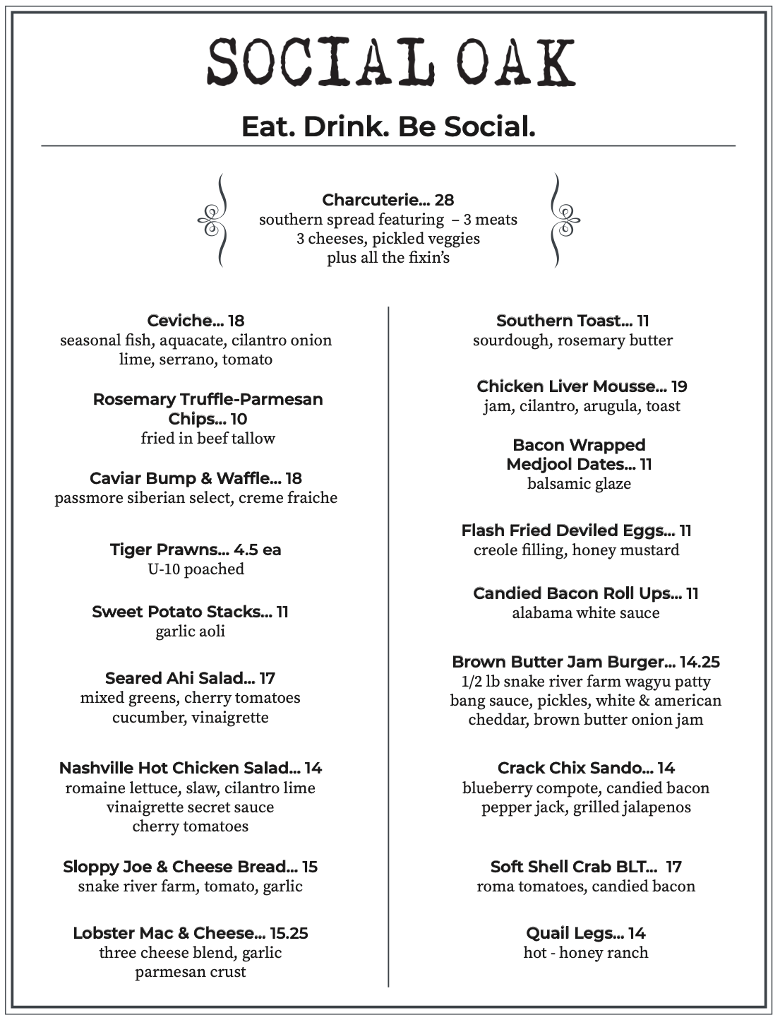 Social Oak isn’t just where you dine—it’s where neighbors become friends, milestones are toasted, and new traditions take root. Whether you’re stopping by for a quiet evening or a lively night out, you’ll find a seat at the table and a welcome worth remembering.